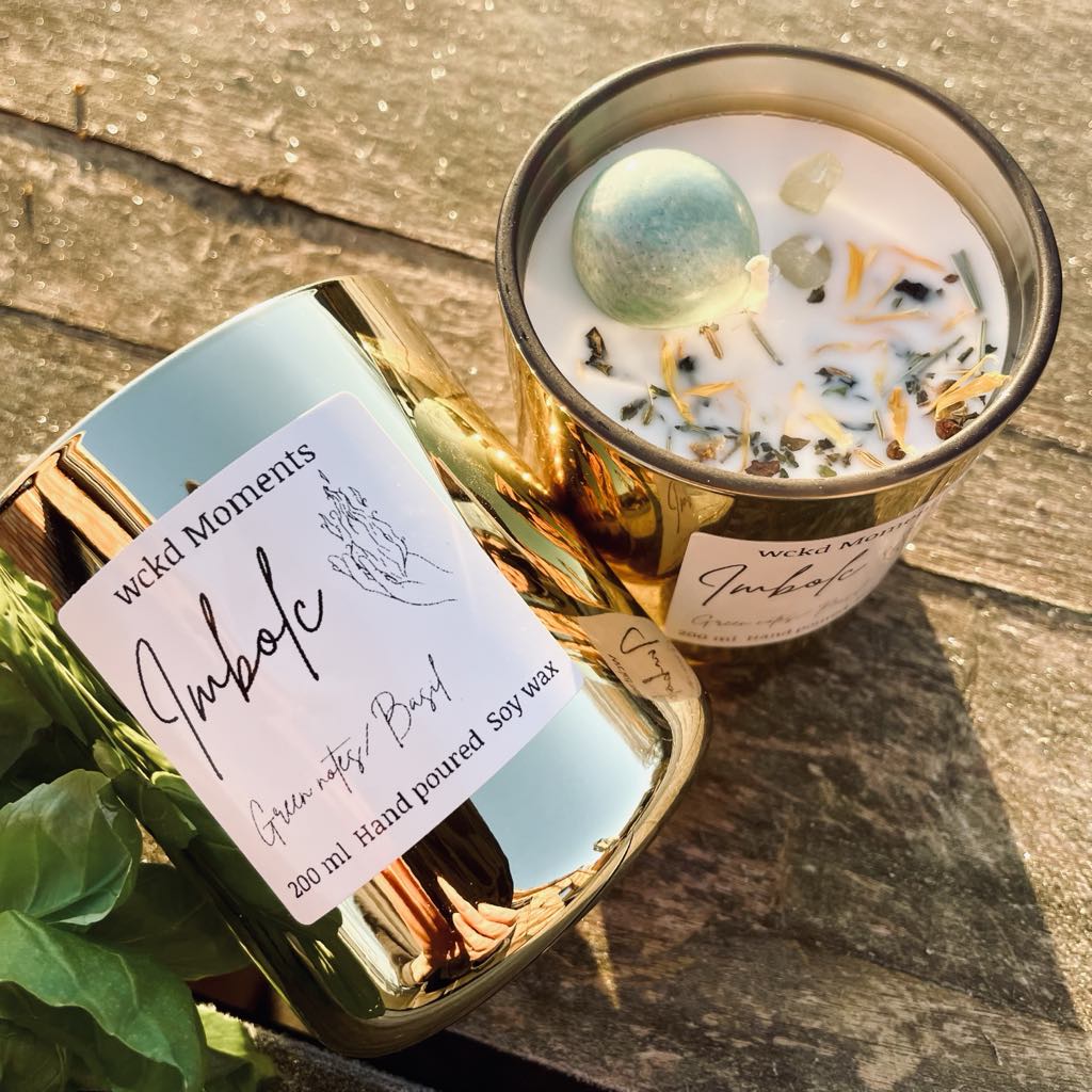 Laat je betoveren door Imbolc, een geurkaars geïnspireerd op het Keltische feest van het licht en de vernieuwing. Met frisse groene akkoorden als topnoten brengt deze geur de eerste tekenen van de lente tot leven. In het hart ontvouwt zich de kruidige warmte van basilicum, terwijl de basis van gourmand noten een subtiele, troostende zoetheid toevoegt.