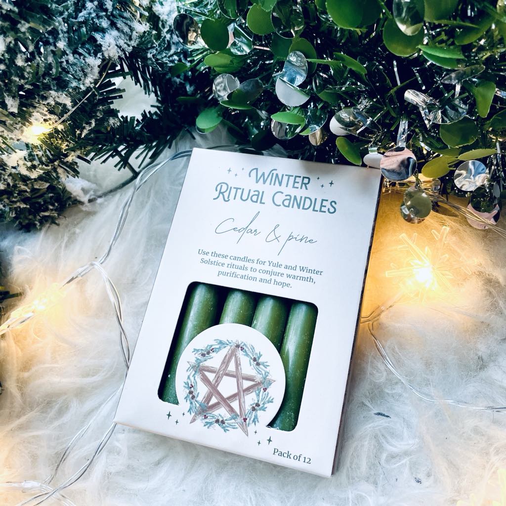 Een verpakking van 12 Winter Ritual-kaarsen in een Cedar and Pine-geur. Gebruik deze kaarsen voor Yule- en Winter Solstice-rituelen, de oude heidense feestdag die bekendstaat om tradities en rituelen die de natuur, wedergeboorte, transformatie en het aankomende seizoen vieren, om warmte, zuivering en hoop op te roepen.