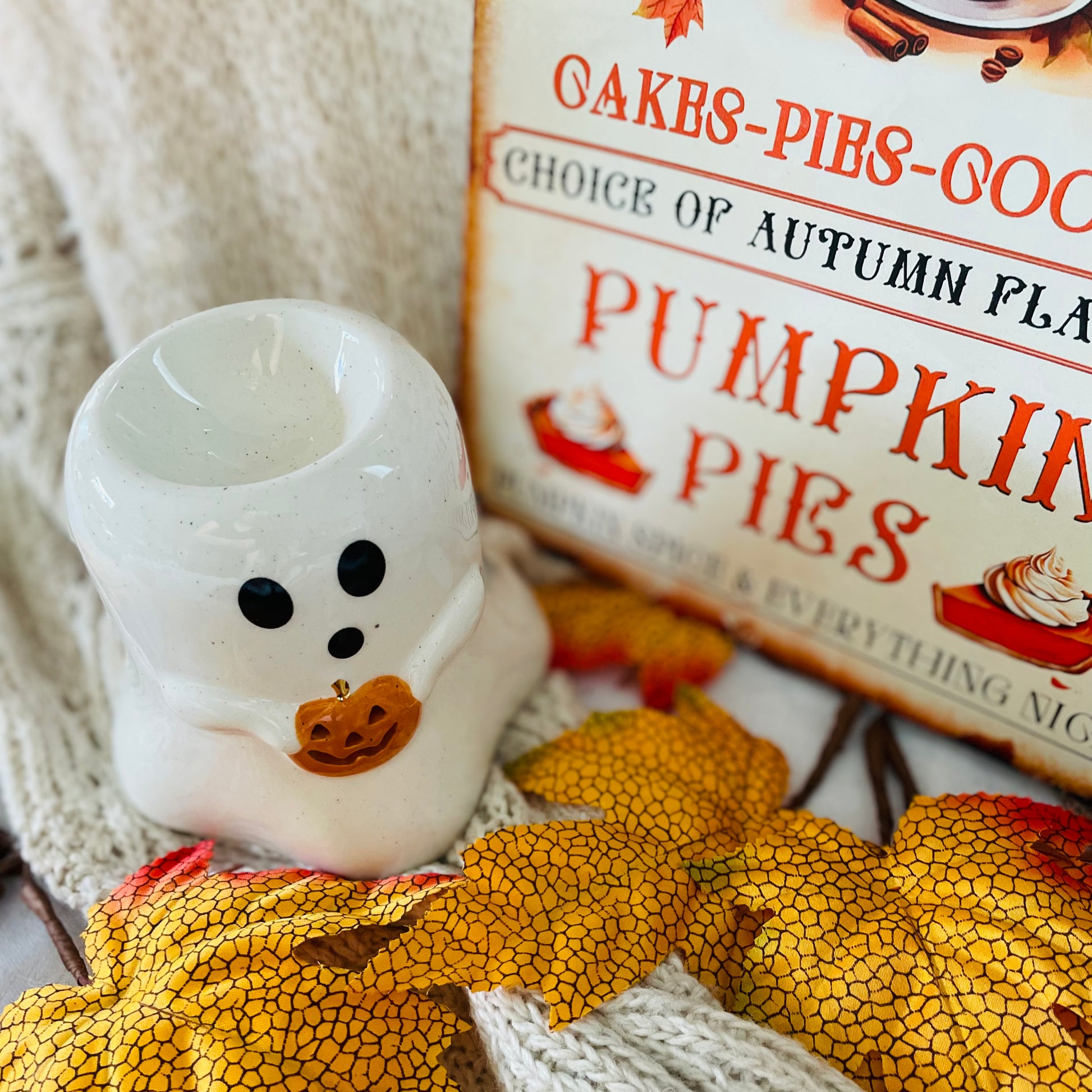 Stel je een schattig spookje voor, zacht en sierlijk gevormd, dat een klein pompoentje vasthoudt. Dit is geen gewoon decorstuk: het is een wasbrander die magie en gezelligheid in je kamer brengt. Plaats een standaard waxinelichtje in de uitsparing aan de achterkant van het spookje en leg een waxmeltje bovenin de wasbrander. Zodra het kaarsje brandt, begint de pompoen te gloeien en verspreidt het spookje een warme, flikkerende gloed. De zachte warmte smelt het waxmeltje langzaam, waardoor een heerlijke geur zich door de kamer verspreidt. Het resultaat is een betoverend samenspel van licht en aroma, perfect voor een knusse avond of een gezellige herfststemming.